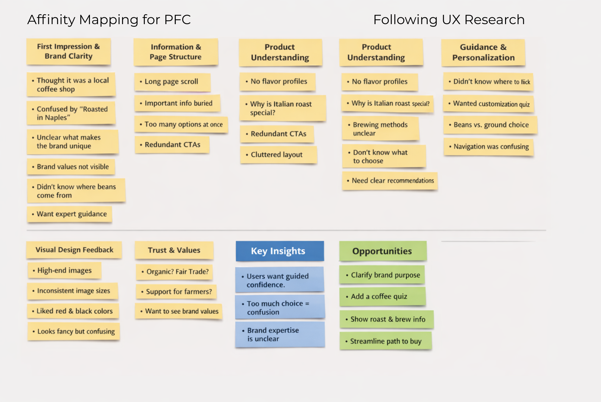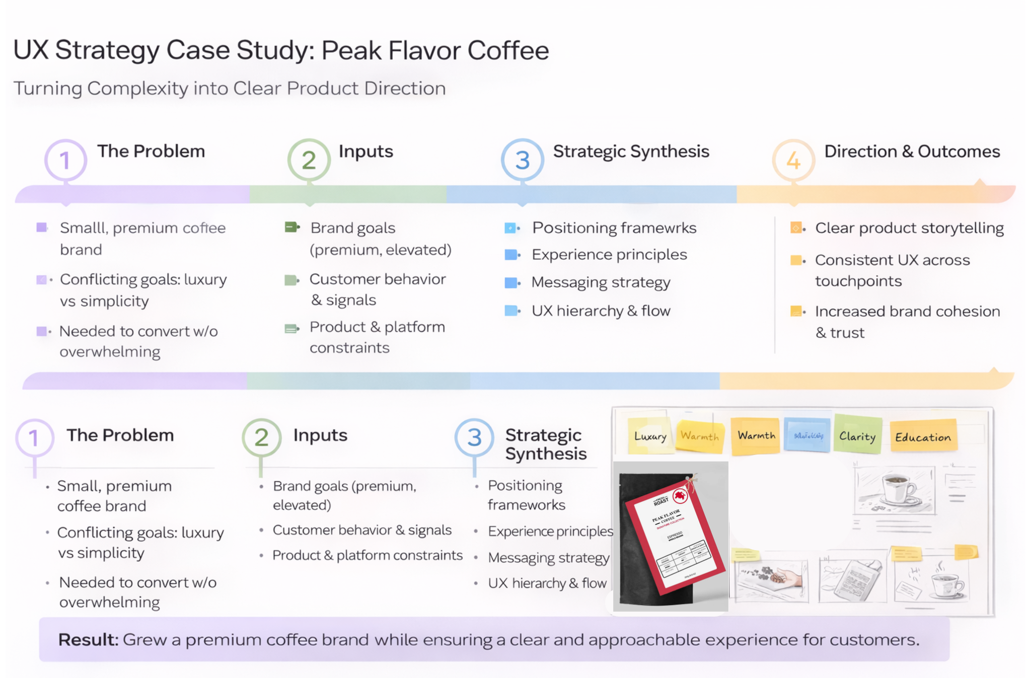 UX strategy case studies for an E-commerce coffee brand focused on translating research, business goals, and ambiguity into clear product direction.