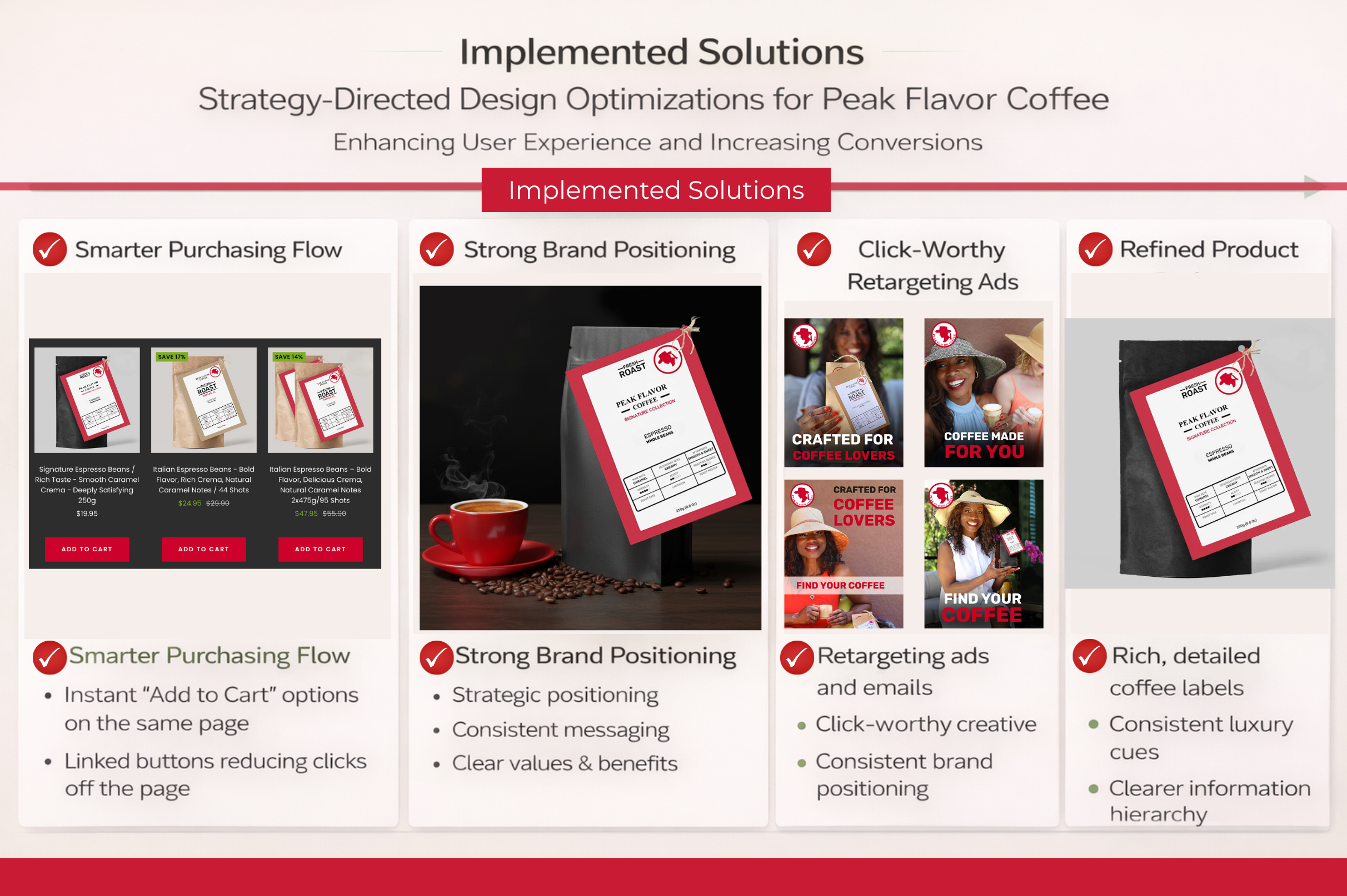 Peak Flavor Coffee, 2024- After deployment of new home page :Total orders up- 23%, Online store sessions up 93%, returning customer rate up 27%, CTR increased 10%